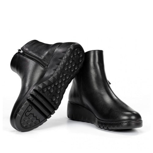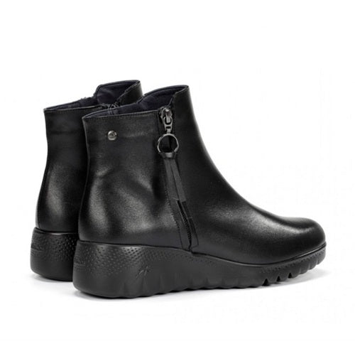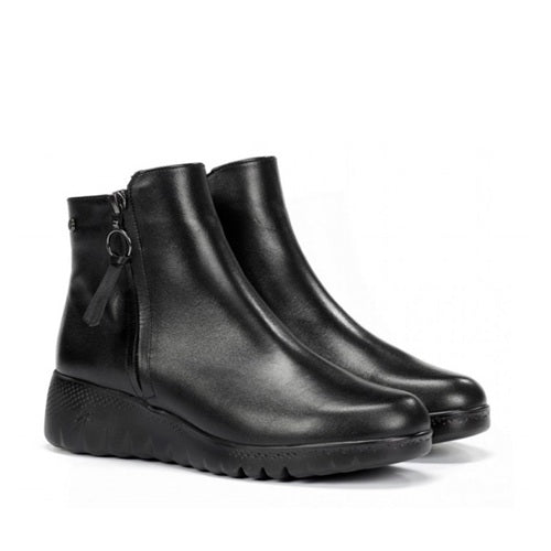 Fluchos Comfort Μποτάκι Live F2100 Μαύρο με ένα διακοσμητικό φερμουάρ στην εξωτερική πλευρά που κοσμείται από δερμάτινες λωρίδες και ένα φερμουάρ στην εσωτερική πλευρά ώστε να εφαρμόζει εύκολα σε κάθε πόδι. Το Fluchos Comfort Μποτάκι Live F2100 Μαύρο διαθέτει αποσπώμενο και μαλακό πάτο. Η μαύρη ενιαία σόλα του είναι αντιολισθητική, πολύ ελαφριά, κατασκευασμένη από EVA που προσφέρει απορρόφηση κραδασμών και ανάλαφρο βάδισμα.