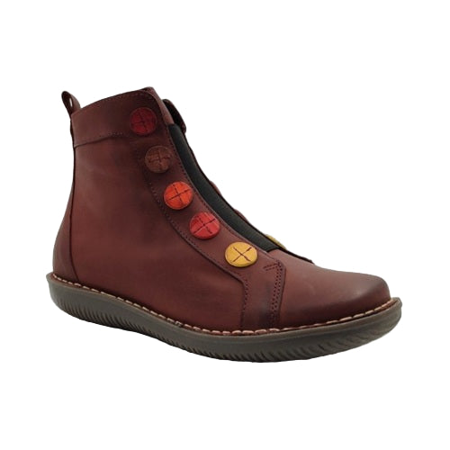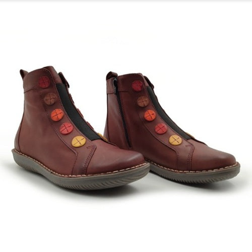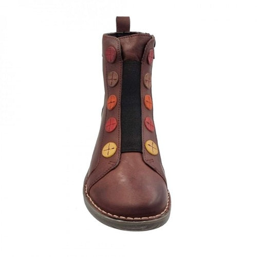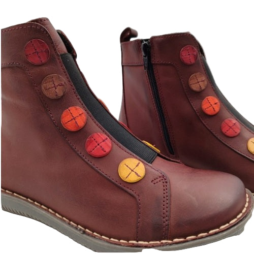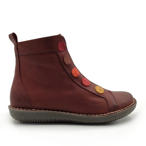 Chacal Μποτάκι Vino 6419-1747 Σκούρο Μπορντό με ένα ενιαίο λάστιχο στο επάνω μέρος αντί για κορδόνια και πολύχρωμα διακοσμητικά κουμπιά δεξιά και αριστερά. Στο πλάι υπάρχει φερμουάρ για γρήγορη και εύκολη εφαρμογή. Το χειροποίητο αυτό μποτάκι είναι δερμάτινο εξωτερικά, ενώ εσωτερικά διαθέτει επένδυση για ευχάριστη ζεστασιά και απαλότητα τις κρύες μέρες του χειμώνα. Ο πάτος είναι μαλακός. Η σόλα είναι αντικραδασμική και αντιολισθητική για άνεση και ασφάλεια σε κάθε βήμα.