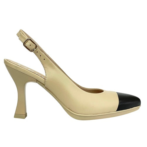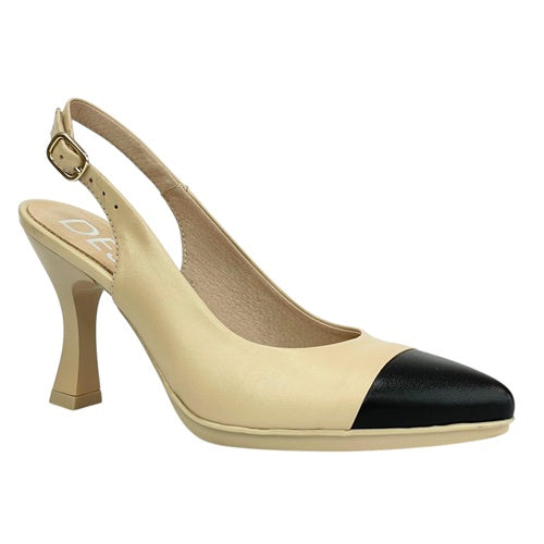 Desiree Πέδιλο Sami11 Μπεζ-Μαύρο κλειστό στα δάκτυλα με μαύρη λεπτομέρεια και ανοιχτό πίσω στην πτέρνα. Στο πίσω μέρος διαθέτει ρυθμιζόμενη μεταλλική αγκράφα ώστε να εφαρμόζει καλύτερα σε κάθε πόδι. Το μαλακό πέλμα που διαθέτει σε συνδυασμό με το μαξιλαράκι στο μετατάρσιο και την Total Flex τεχνολογία προσφέρουν μεγαλύτερη άνεση, εξαιρετική ευελιξία και απορρόφηση κραδασμών. Η σόλα είναι αντιολισθητική και αντικραδασμική για άνεση και σταθερότητα σε κάθε σας βήμα.